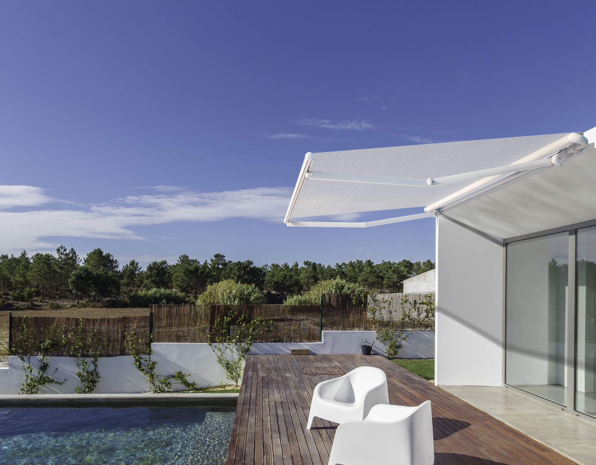 Sandei Retractable Awning is excellent protection against glaring heat. Available in manual or motorised systems, it is the solution for a relaxing outdoor experience. Awning is not recommended for extreme weather.